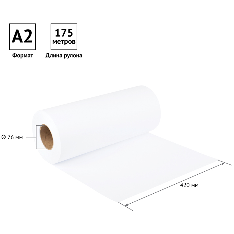 Размер бумажного полотна составляет 420 мм, что соответствует формату А2. Длина рулона - 175 м. Внутренний диаметр втулки - 76 мм.