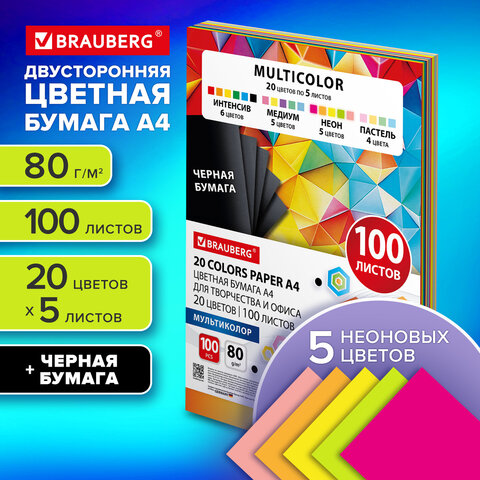 Бумага цветная 20 цветов BRAUBERG MULTICOLOR А4, 80 г/м2, 100 л., (20 цветов x 5 листов), 116649