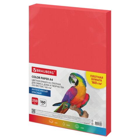 Бумага цветная ПЛОТНАЯ BRAUBERG, А4, 160г/м2, 250л, красная, интенсив, для печати, творчества, 11667