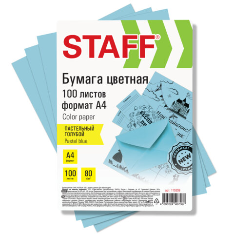 Бумага цветная STAFF, А4, 80г/м, 100 л, пастель, голубая, для офиса и дома,хххххх