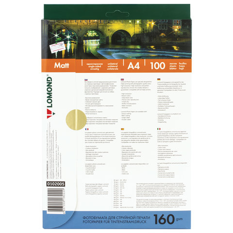 Фотобумага А4, 160 г/м2, 100 листов, односторонняя, матовая, LOMOND, 0102005