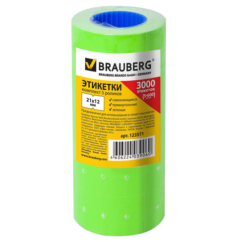 Этикет-лента 21х12 мм, прямоугольная, зеленая, 1 рулон по 600 шт., BRAUBERG, 123571