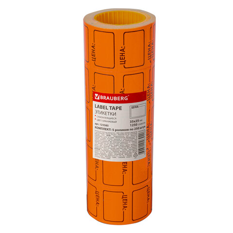 Ценник средний "Цена" 35х25 мм, оранжевый самоклеящийся, набор 5 рулонов по 250 шт., BRAUBERG, 12