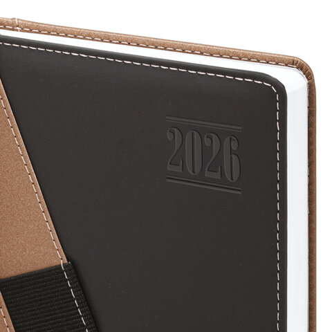 Выполнен в стильном сочетании коричневого и черного цветов. Обложка подходит для горячего тиснения. Дополнением является закладка-ляссе, с помощью которой при необходимости можно быстро открыть ежедневник на нужной странице и держателем для ручки. Ежедневник снабжен справочным материалом. В конце имеются 4 страницы для записей и заметок.