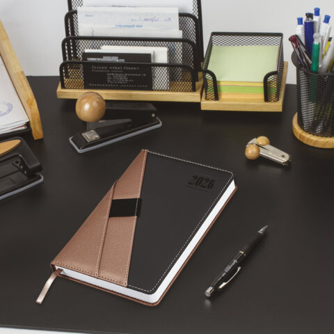 Внутренний блок включает 168 листов белой бумаги плотностью 70 г/м2. Каждая страничка имеет перфорированный угол. Благодаря стандартному формату А5 (138х213 мм) датированный ежедневник удобно использовать как в офисе, так и на выездных деловых встречах.