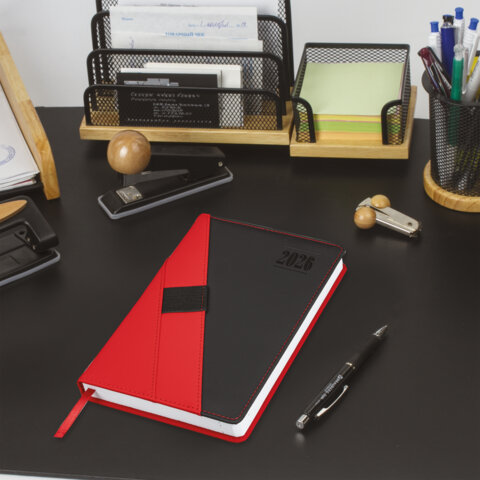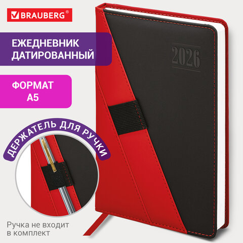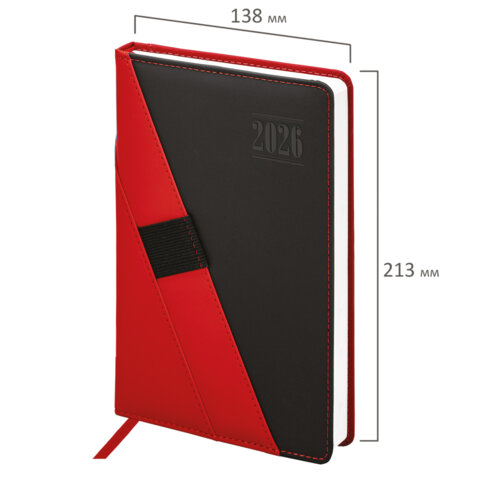 Ежедневник датированный 2026 А5 138х213мм BRAUBERG Swirl, под кожу, держатель для ручки, красный, 11