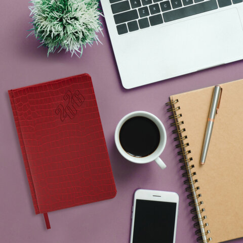 Внутренний блок включает 168 листов тонированной бумаги плотностью 70 г/м2. Каждая страничка имеет перфорированный угол. Благодаря стандартному формату А5 (138х213 мм) ежедневник удобно использовать как в офисе, так и на выездных деловых встречах. Материал обложки насыщенного красного цвета подходит для горячего тиснения. Срез ежедневника фольгирован золотой фольгой, что придает ему особый шарм.