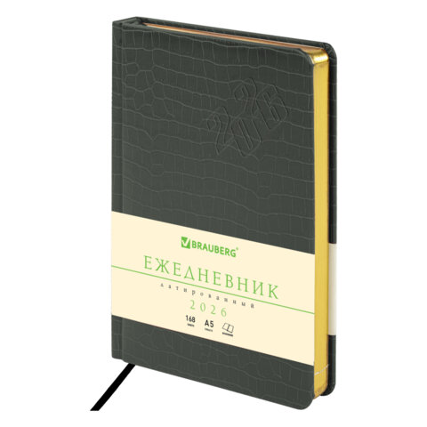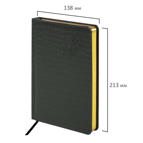 Внутренний блок включает 168 листов тонированной бумаги плотностью 70 г/м2. Каждая страничка имеет перфорированный угол. Благодаря стандартному формату А5 (138х213 мм) ежедневник удобно использовать как в офисе, так и на выездных деловых встречах. Материал обложки благородного серого-зеленого цвета подходит для горячего тиснения. Срез ежедневника фольгирован золотой фольгой, что придает ему особый шарм.