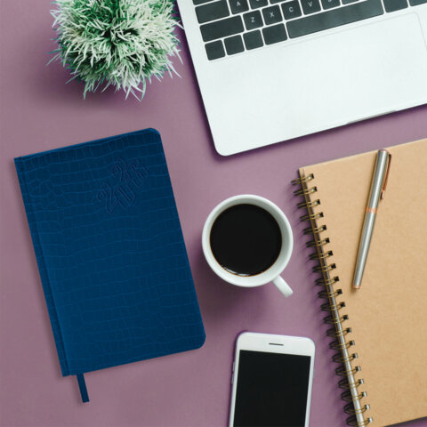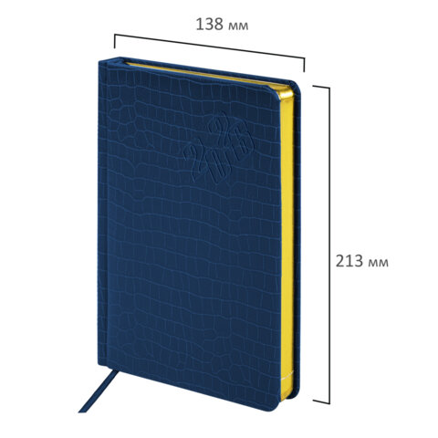 Внутренний блок включает 168 листов тонированной бумаги плотностью 70 г/м2. Каждая страничка имеет перфорированный угол. Благодаря стандартному формату А5 (138х213 мм) ежедневник удобно использовать как в офисе, так и на выездных деловых встречах. Материал обложки насыщенного синего цвета подходит для горячего тиснения. Срез ежедневника фольгирован золотой фольгой, что придает ему особый шарм.