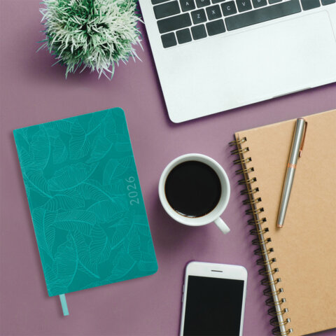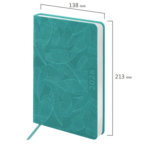 Ежедневник датированный 2026 А5 138x213мм BRAUBERG Foliage, под кожу гибкий, бирюзовый, 117127