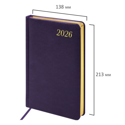Внутренний блок включает 168 листов тонированной бумаги плотностью 70 г/м2. Каждая страничка имеет перфорированный угол. Благодаря стандартному формату А5 (138х213 мм) ежедневник удобно использовать как в офисе, так и на выездных деловых встречах. Твердая обложка стилизована под кожу рептилии благородного темно-фиолетового цвета. Подходит для горячего тиснения. Срез ежедневника фольгирован золотой фольгой, что придает ему особый шарм. Дополнением является закладка-ляссе, с помощью которой при необходимости можно быстро открыть ежедневник на нужной странице.