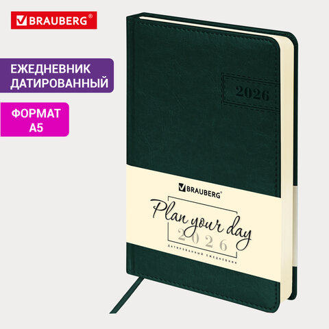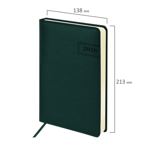 Ежедневник датированный 2026 А5 138x213мм BRAUBERG Imperial, под кожу, темно-зеленый, 117066