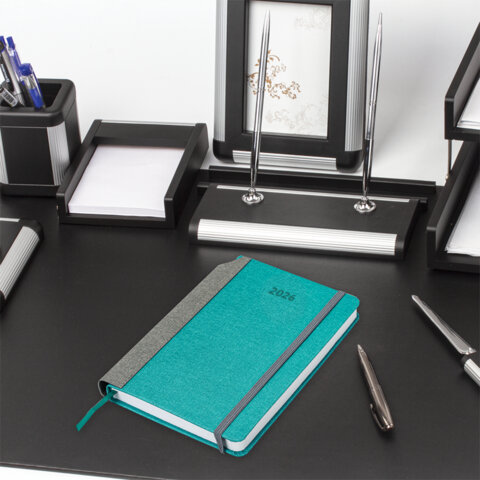 Выполнен в стильном сочетании бирюзового и серого цветов. Жесткая книжная обложка стилизована под искусственную кожу с текстурой льна, фиксируется резинкой, поэтому ежедневник не откроется в сумке или портфеле и страницы не помнутся. Материал обложки подходит для горячего тиснения. Для удобства пользования ежедневник снабжен карманом для фиксации ручки. Дополнением является закладка-ляссе, с помощью которой при необходимости можно быстро открыть ежедневник на нужной странице.