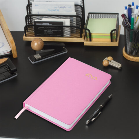 Жесткая книжная обложка насыщенного розового цвета с легкой рельефной фактурой напоминает натуральную кожу. Материал обложки – балакрон, подходит для тиснения только фольгой. Дополнением является закладка-ляссе, с помощью которой при необходимости можно быстро открыть ежедневник на нужной странице. Помимо прочего, ежедневник снабжен обширным справочным материалом. В конце имеются 4 страницы для записей и заметок.