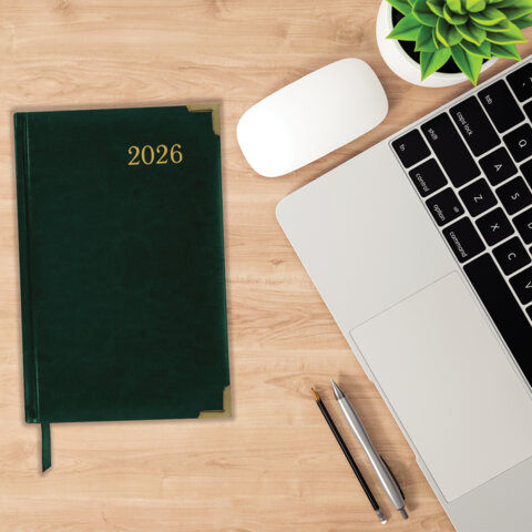 Твердая обложка благородного зеленого цвета стилизована под гладкую кожу. Подходит для горячего тиснения. Ежедневник имеет металлические уголки, что придает ему особый шарм. Дополнением является закладка-ляссе, с помощью которой при необходимости можно быстро открыть ежедневник на нужной странице. Помимо прочего, ежедневник снабжен обширным справочным материалом. В конце имеются 4 страницы для записей и заметок.