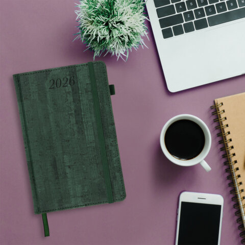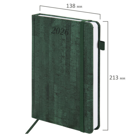 Ежедневник датированный 2026 А5 138x213мм BRAUBERG Wood, под кожу, держатель для ручки, зеленый, 117