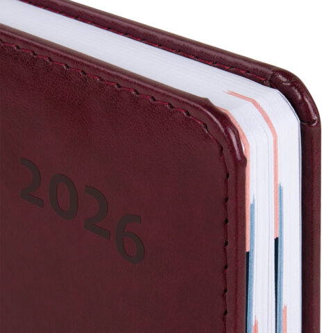 Дополнением является закладка-ляссе, с помощью которой при необходимости можно быстро открыть ежедневник на нужной странице, а также вырубка по месяцам. Помимо прочего, ежедневник снабжен обширным справочным материалом. В конце ежедневника есть 6 страниц для записей и заметок. Выполнен в классическом бордовом цвете.
