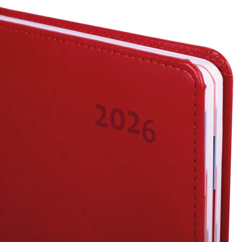 Дополнением является закладка-ляссе, с помощью которой при необходимости можно быстро открыть ежедневник на нужной странице, а также вырубка по месяцам. Помимо прочего, ежедневник снабжен обширным справочным материалом. В конце ежедневника есть 6 страниц для записей и заметок. Выполнен в насыщенном красном цвете.