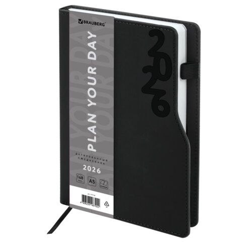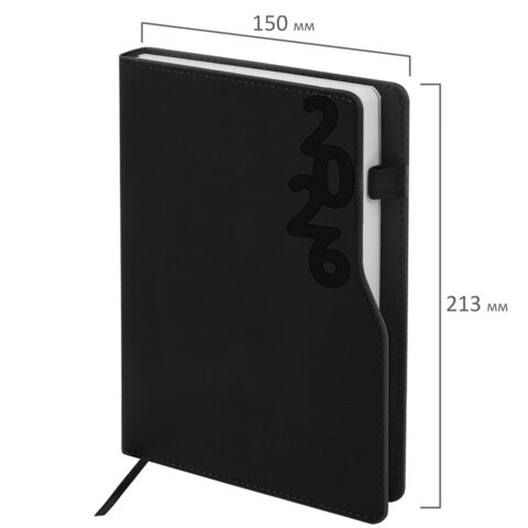 Ежедневник датированный 2026 А5 150x213мм BRAUBERG Up, под кожу софт-тач, держатель для ручки, черны