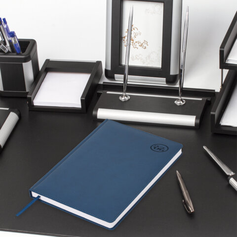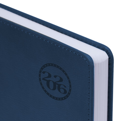 Внутренний блок включает 168 листов белой бумаги плотностью 70 г/м2. Каждая страничка имеет перфорированный угол. Благодаря большому формату А4 (210х297 мм) ежедневник удобно использовать как в офисе, так и на выездных деловых встречах. Твердая обложка стилизована под фактурную кожу благородного синего цвета и прошита по периметру. Материал обложки подходит для горячего тиснения.