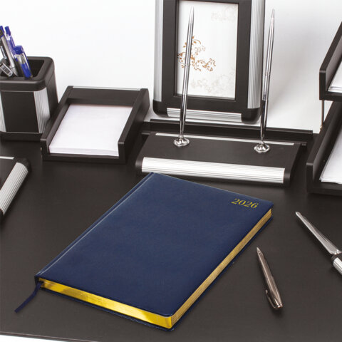 Срез ежедневника фольгирован золотой фольгой, что придает ему особый шарм. Дополнением является закладка-ляссе, с помощью которой при необходимости можно быстро открыть ежедневник на нужной странице. Ежедневник снабжен обширным справочным материалом. В конце ежедневника есть 4 страницы для записей и заметок.