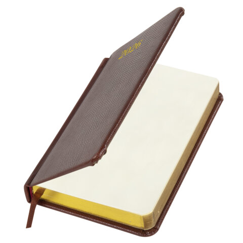 Внутренний блок включает 168 листов тонированной бумаги плотностью 70 г/м2. Каждая страничка имеет перфорированный угол. Благодаря малому формату А6 (100х150 мм) ежедневник удобно использовать как в офисе, так и на выездных деловых встречах. Твердая обложка классического коричневого цвета стилизована под кожу рептилии. Подходит для горячего тиснения. Срез ежедневника фольгирован золотой фольгой, что придает ему особый шарм.