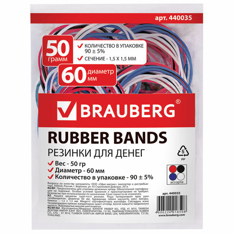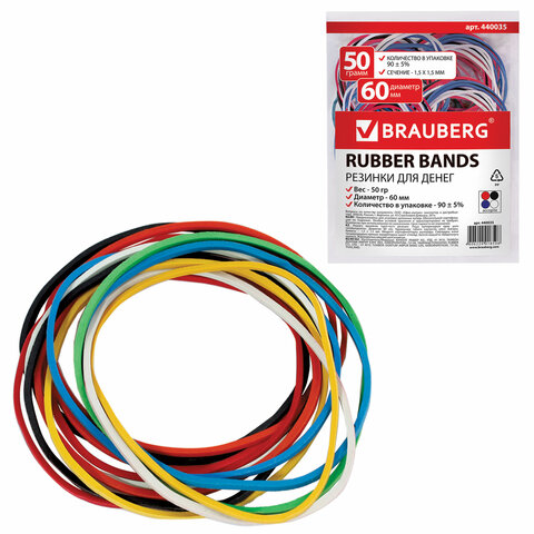 Резинки для денег банковские универсальные диам 60 мм, BRAUBERG 50 г, цв., натур. каучук, 440035