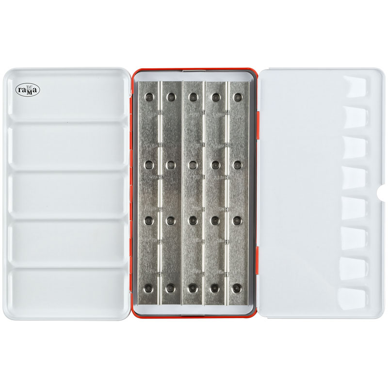 Пеналы подходят для создания индивидуальной палитры цветов и хранения кювет с любимыми цветами. На обороте пенала расположено специальное кольцо под палец для надежной фиксации в руке художника во время работы. Пенал оснащен раскладной палитрой для смешивания красок. Внутри пенал белого цвета − для чистого смешения оттенков. В комплекте салфетка из микрофибры для очистки палитры или промокания кисти. Также салфеткой можно убрать излишки воды с бумаги.