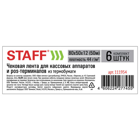 Чековая лента ТЕРМОБУМАГА 80 мм (диаметр 56 мм, длина 50 м, втулка 12 мм), 44 г/м2,