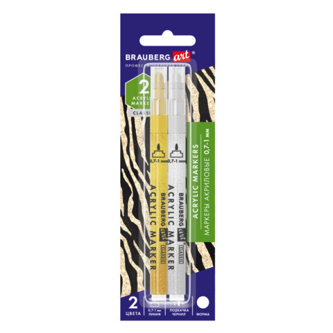 Маркеры акриловые для рисования и хобби, 2 цвета ЗОЛОТО/СЕРЕБРО, линия 0,7-1 мм, BRAUBERG ART, 15252